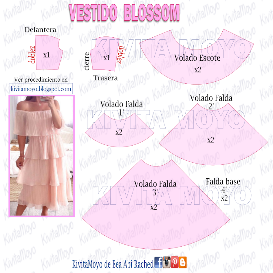 Cortar 1 vez en el doblez de la tela: la delantera y la parte trasera. Cortar extendido 2 veces el volado del escote. Cortar 2 veces cada una de las capas de la falda. Cortar 2 veces las piezas de la falda base.