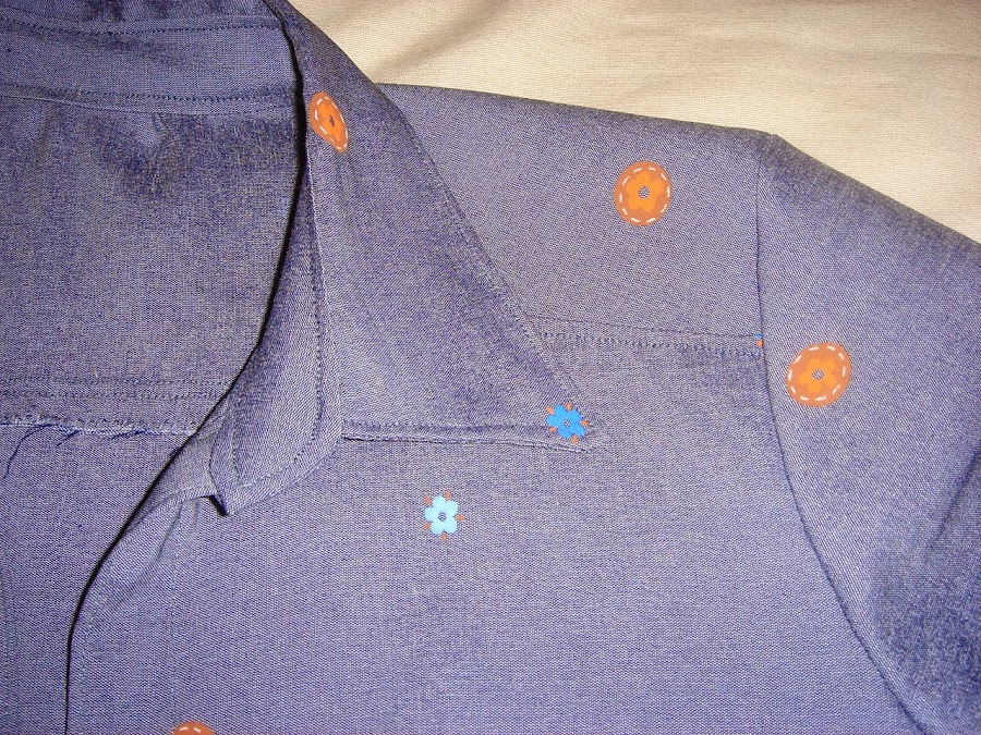 El cuello es camisero tambien lleva canesu en el delantero y manga montada corta.