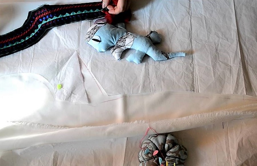 Doblo la tela derecho contra derecho para poner los patrones sobre el revés. Doblo un extremo de la tela hasta el centro y el otro extremo también hasta el centro. De esta forma tengo dos partes de tela doblada, una será el centro del delantero y otra de la espalda. Pongo el patrón y marco con una tiza o marcador de tela, pero en la parte delantera pongo también en el centro delantero el centro de nuestro cuello, yo lo he doblado por la mitad y puesto el doblez justo encima del doblez del centro delantero, corto así la forma del escote delantero, justo medio centímetro más de lo que veo en el cuello.