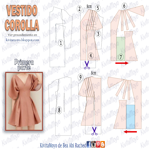 Este vestido tiene una cintura entallada en una pinza cosida, pero desde la misma continua una falda tableada. Para este propósito, se debe incorporara allí espacio para el tablón. . El modelo no tiene unión desde la cintura, mostrando la continuación del entalle unido a la falda. Por lo tanto se le ha colocado una costura en e centro, repartiendo a la delantera en dos piezas compuestas cada una. Las mangas con un concepto de manga japonesa, se pliega sobre si misma hasta conectarse en la cintura por debajo del brazo.