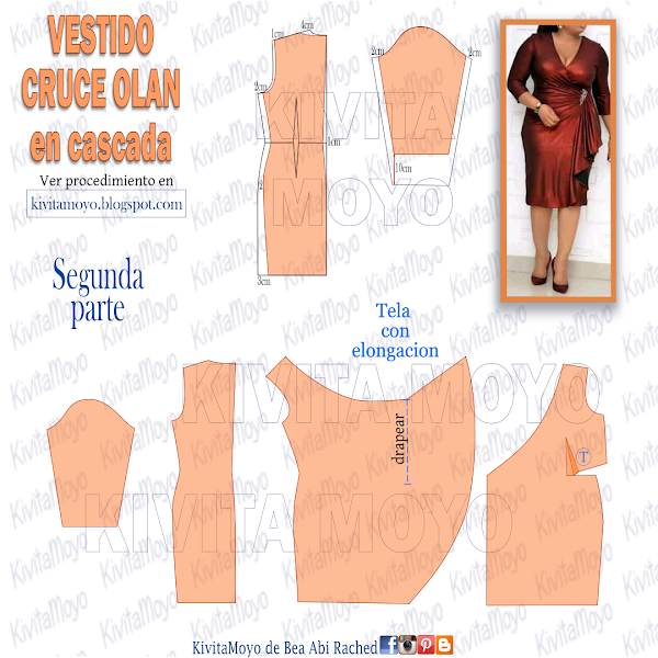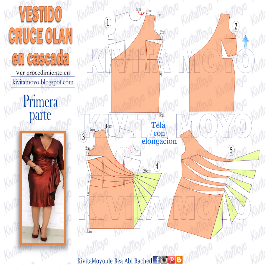 En este caso se presenta con una tela tipo lame, pero bien se puede hacer con una tela sin brillo, o con estampados. También se pueden suprimir las mangas, así como también el modelo puede variar con el olan o bien eliminándolo, y así terminar el efecto en un drapeado finalizado en la costura lateral. En todos los casos la tela debe ser elastizada.