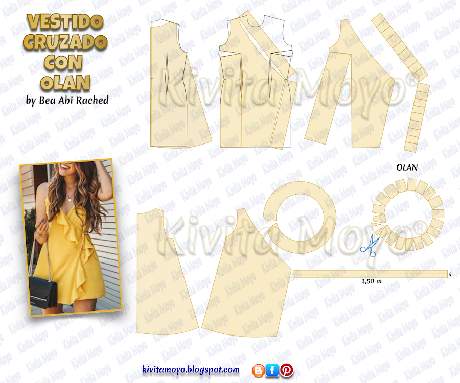 Por ultimo dibujar un rectangulo para las tiras de 4 cm de ancho por 1,50m de largo. Se cortaran 2 piezas iguales que se coseran en el final del escote. Al unir el lateral derecho con el trasero del vestido se dejara un mini espacio sin coser que funcionara como ojal para introducir por alli la tira que parte del escote opuesto, y asi rodeara el cuerpo para encontrarse en el lateral con la tira del lado del olan.