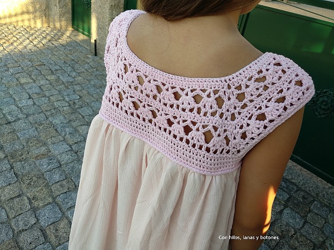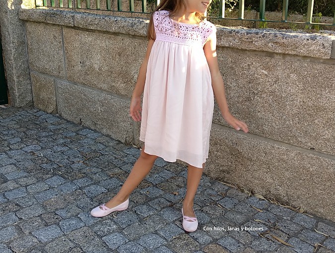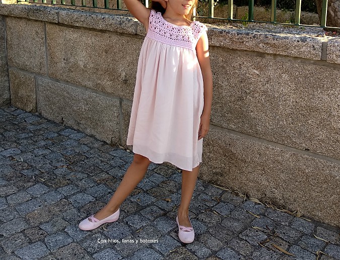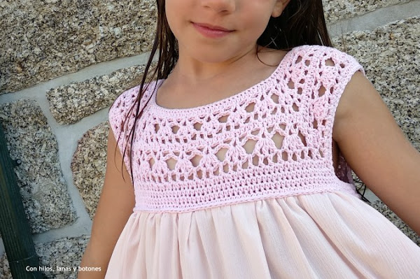 Hace dos veranos le hice a mi niña un vestido con el cuerpo de ganchillo compuesto por unos granny squares combinados con varetas y puntos bajos. Ese mismo verano hice otro vestido más, pero de bebé, con el canesú sencillito de ganchillo.