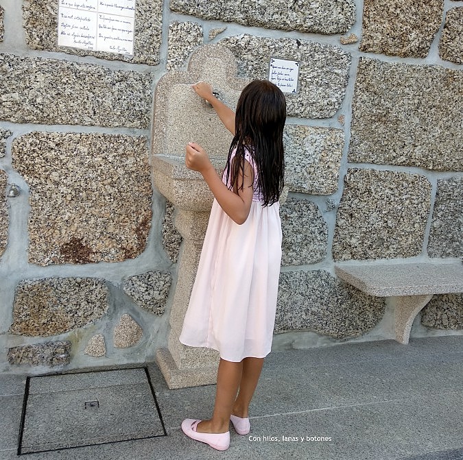 Es un proyecto sencillo y rápido. Después de todas las pruebas, el canesú definitivo lo hice un sábado por la tarde en la playa. El domingo por la mañana hice los dobadillos de la tela, cerré la costura y marqué con la máquina para fruncir. Íbamos a piscinear un poco así que lo metí en la bolsa y lo fui cosiendo a mano poco a poco mientras la peque se arrugaba a remojo.