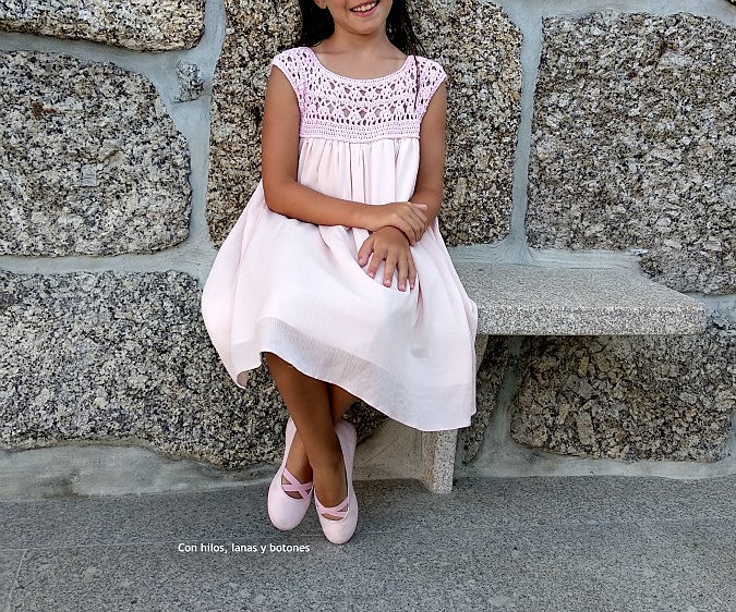Me gustó el resultado del primer vestido, así que este año quería repetir. Tenía un retal de bambula comprado en Base Básica antes de que cerrara y me apetecía hacerle a mi niña un blusón o un vestido con esa tela y la parte superior de ganchillo. Había buscado ideas por a red sin mucho éxito cuando Mamacosesola publicó tan mono en su cuenta de IG.