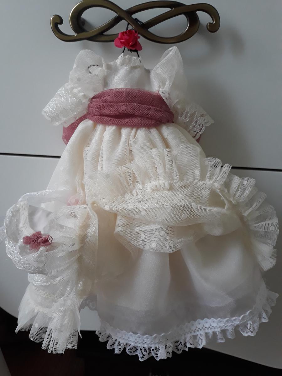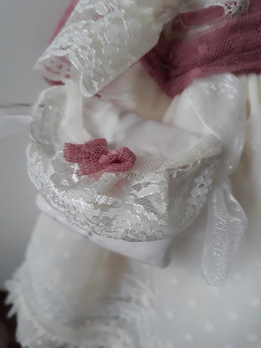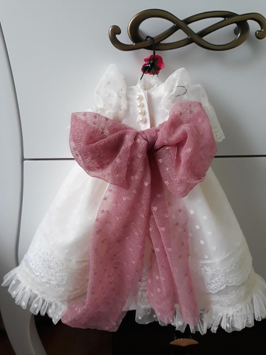 Un vestido hecho con todo los detalles y las mejores calidades en telas, plumeti en blanco roto para el vestido y en rosa palo para el gran lazo.