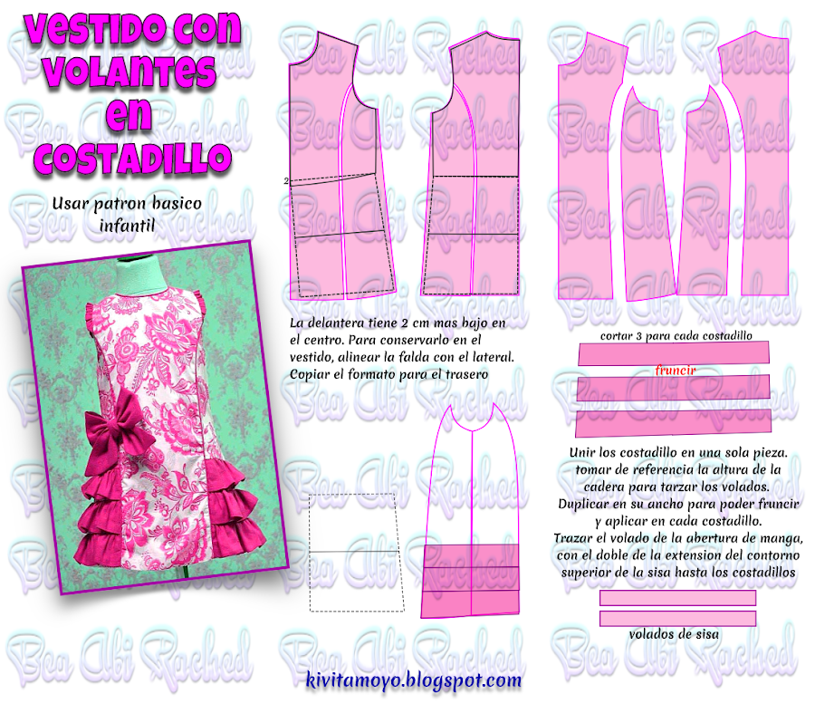 Los volados en la manga lo determina la parte superior del cuerpo, sin tomar en cuenta el costadillo. Duplicar esa medida para crear el voladito a fruncir. En union de costadillo y escote aplicar un cordon forrado a modo de ribete.