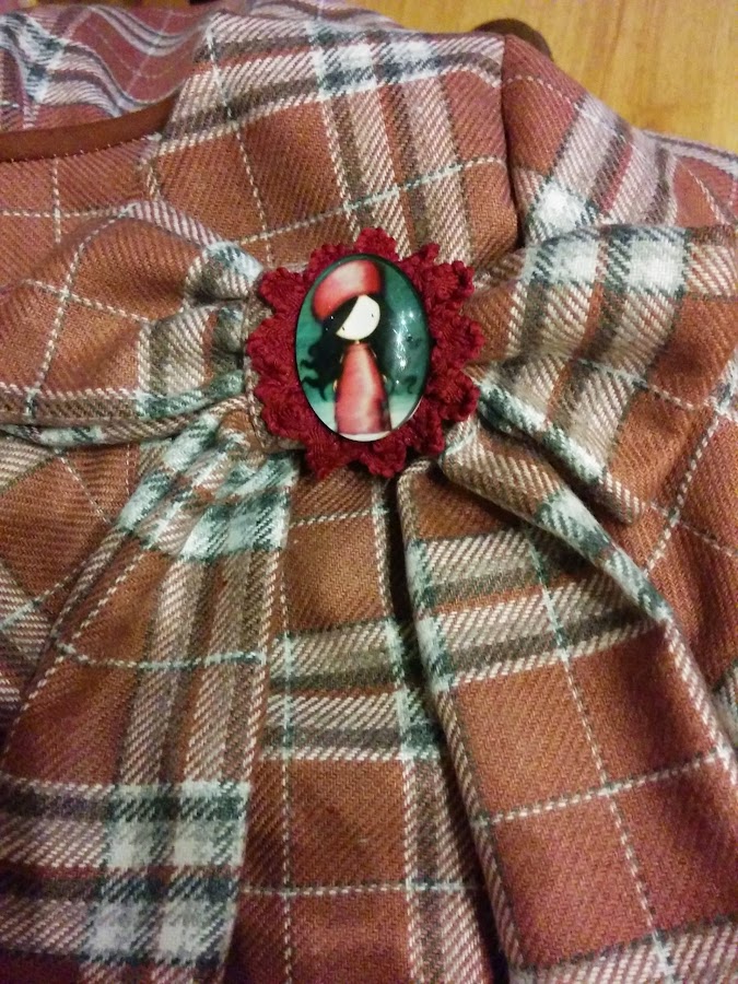 El vestido es de corte imperio, la parte del escote lleva una pieza al bies con una abertura, la manga es tres cuartos y muy ancha, la falda va fruncida sin pinzas, en al espalda lleva cuatro trabillas con cuatro botones en los tonos del vestido, y en el delantero lleva un lazo de la misma tela decorado con un broche también casero.