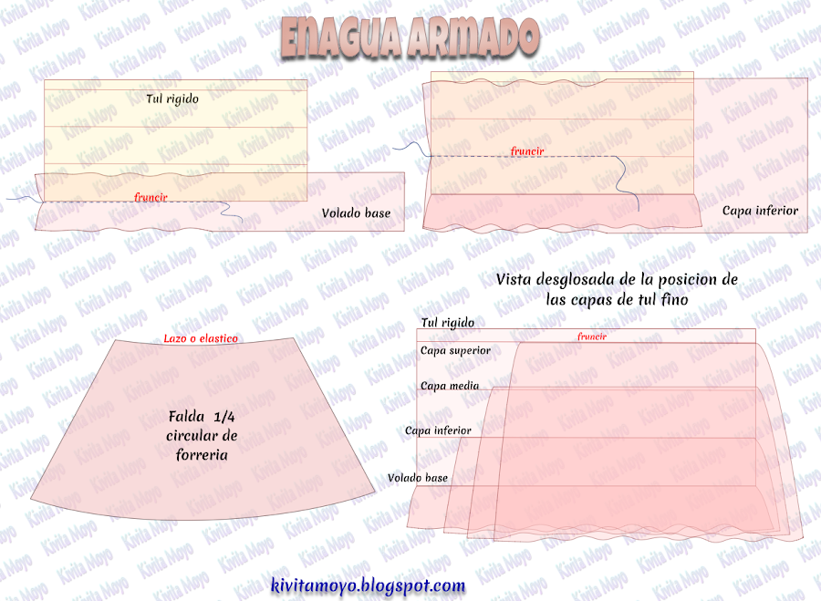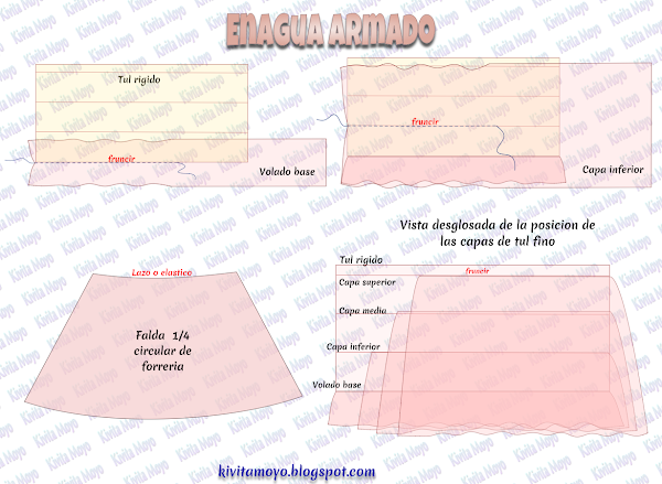 La enagua sera una superposicion de capas de tul fino aplicadas en una base de tul rigido.