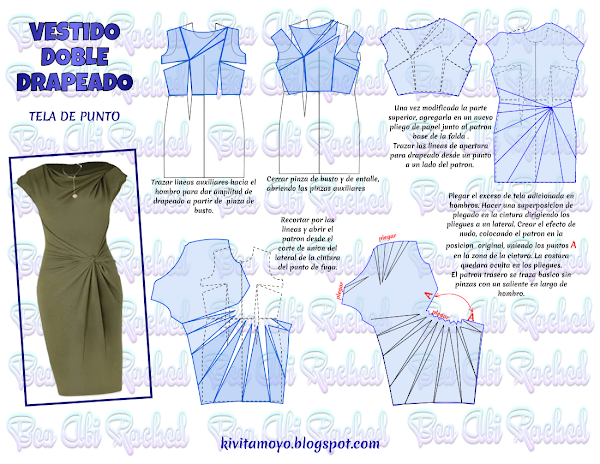 Este modelo de vestido tiene dos etapas de transformacion del patron base. Primero modificaremos la parte superior. Vamos a trazar un escote bote y haremos una saliente en los hombros, creando una manga caida. Trasladaremos la pinza de busto y la de entalle, a los recorte que efectuaremos en hombros para crear la amplitud de los futuros pliegos. Luego modificaremos la parte delantera inferior. Ubicaremos un punto ancla de donde dibujaremos lineas en la direccion que deseemos el drapeado. Cortaremos por las lineas tomando de referencia la que se ubique en la cintura, abriendo el patron para dar amplitud para los pliegues. En la linea de cintura se ubicara la costura donde empalmaremos los pliegues que se deben disponer imitando un anudado. La costura quedara oculta debajo del drapeado.