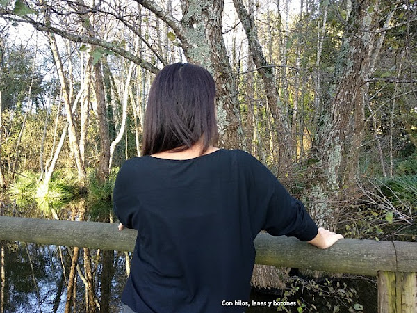 Bárbara hace el escote de la espalda pronunciado y con una tira transversal. Iba a hacerlo igual, me gustaba cómo le quedaba, pero en el último momento, justo antes de meter tijera cambié de idea y dejé la camiseta con escote más o menos barco. A tiempo de cortar siempre estoy.