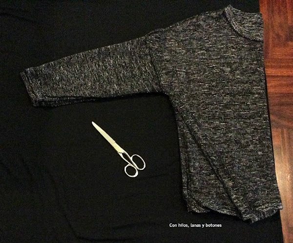 El primer paso siempre es sacar el patrón, pero esta vez no hay patrón. Para la parte superior seguí el video tutorial "Cómo hacer una blusa fácil y sin patrones, manga kimono" de B. Blue DIY. Doblamos la tela por la mitad, colocamos un jersey que nos quede bien y directamente cortamos. Bárbara corta el delantero y luego lo usa de plantilla para cortar la espalda igual. Como mi tela es negra y no tiene dibujos que casar ni nada doblé la tela en cuatro y ya corte juntas ambas partes.