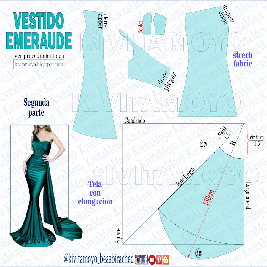 Y la segunda pieza es la media falda o símil cola que se ubica en un lado desde parte del lateral delantero y parte del lateral trasero. Para trazarla haremos el patrón de una falda 1/4 circular. En esta oportunidad veremos como responde puesto que aqui funcionara como un aplique.