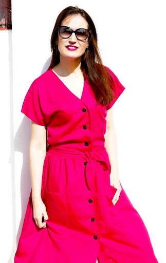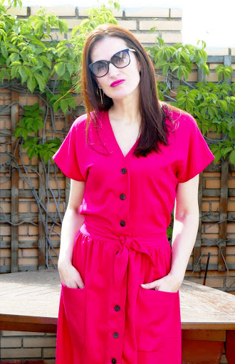 Parece sencillo, de escote pico, con manga caída, pero la cintura que se remata en un lazo cosido y vuelto y bolsillos plastón con costura invisible, hacen que sea un vestido que hay que coser con paciencia.