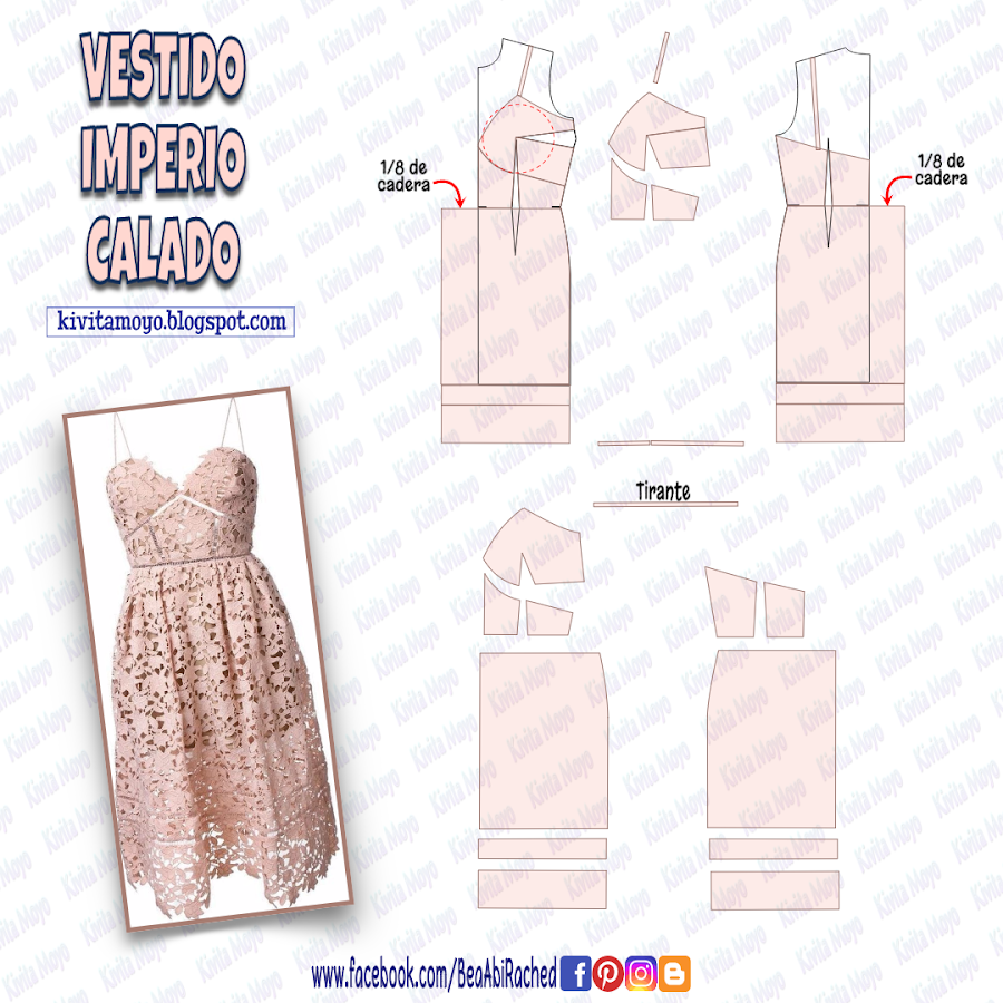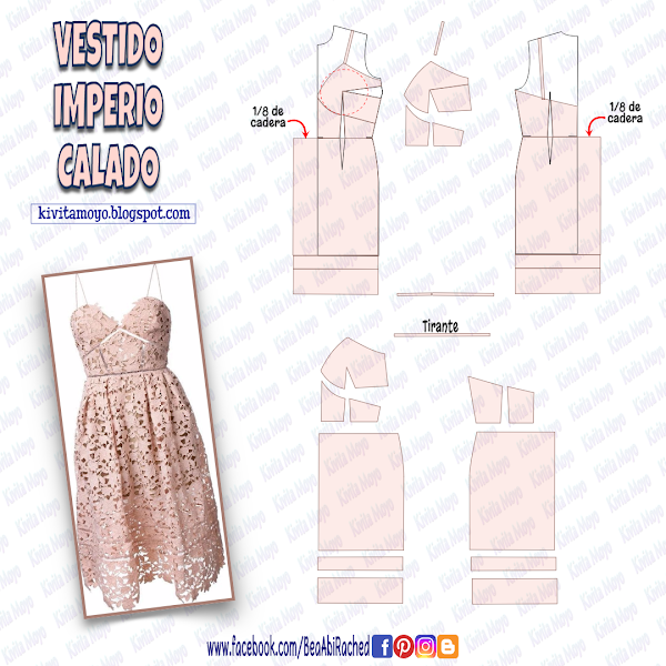 Para la falda prolongar el largo por debajo de la rodilla. Y prolongar desde el ancho por el centro del patrón 1/8 del contorno de cadera. En la parte inferior hacer lineas transversales auxiliares que luego se separaran para intercalar entre las mismas el entredós.