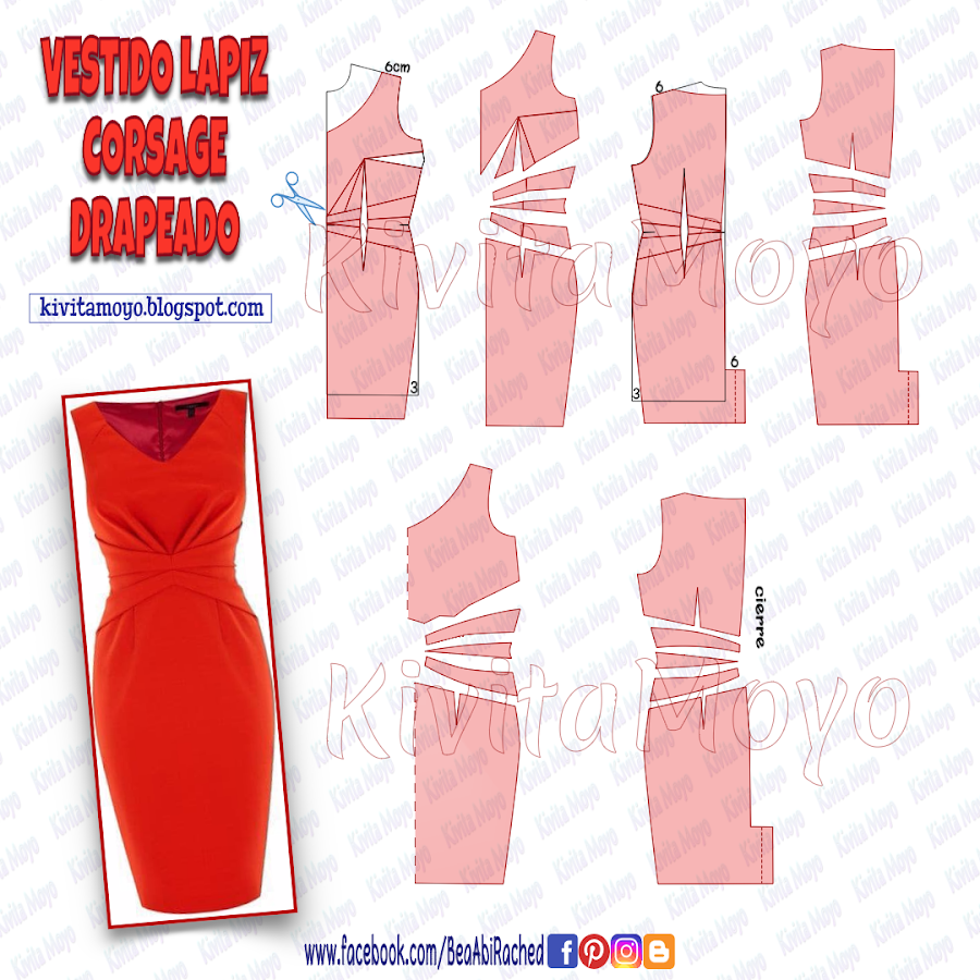 La prenda va forrada, que se cortara con el patrón del vestido básico pinzado, (o sea sin la transformacion de la cintura ni el drapeado) a la que se le dará el largo y el ajuste en el lateral de la falda lápiz.