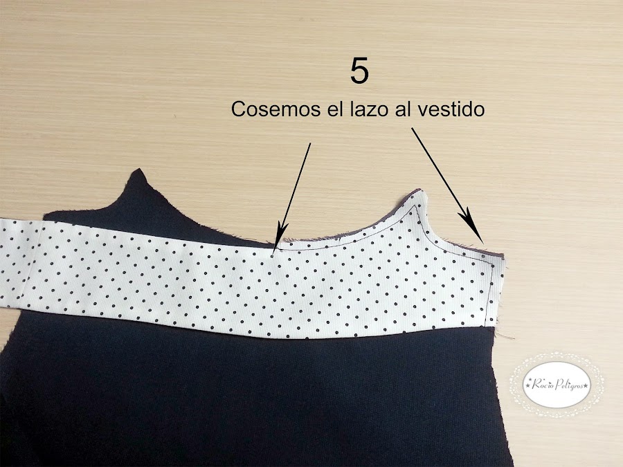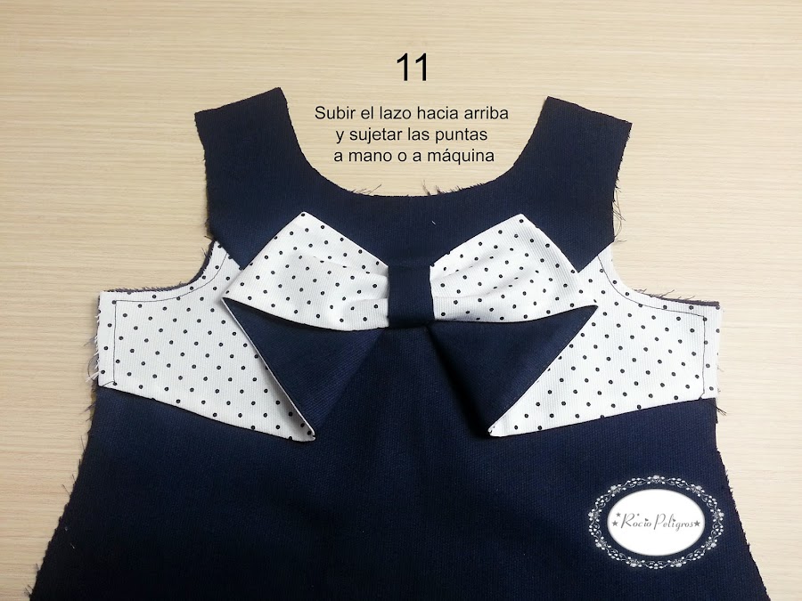 Cosemos el lazo al vestido por los dos lados.
