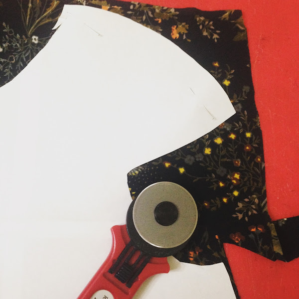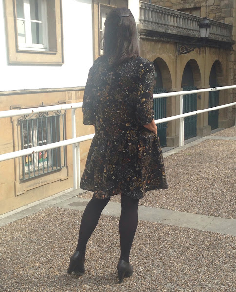 Finalmente me decidí por una tela de crepe con caída en estampado floral sobre fondo negro. Lo que más me gusta son los colores dorados sobre el negro. Es una combinación que me chifla.