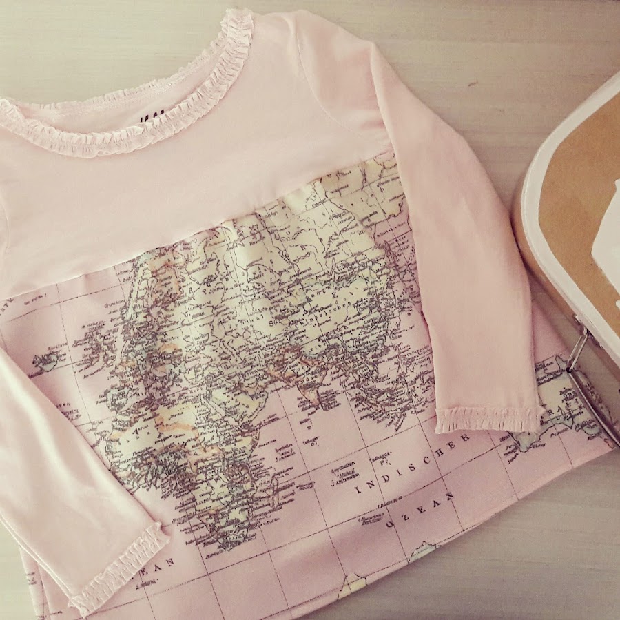A mi me gusta mucho como ha quedado y es muy fácil de hacer.Solo necesitamos una camiseta básica y una tela que nos guste. En este caso he escojido la tela mapamundi en tono rosa, que es siempre un acierto.