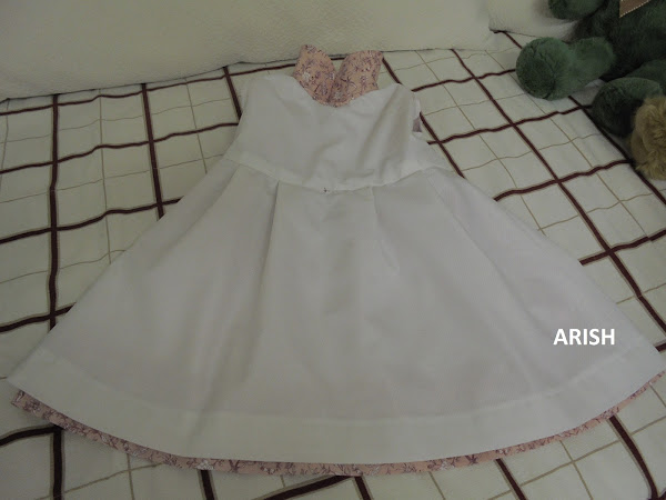 el vestido es clásico, talle alto, manga farol, cuello bebé y fruncido con un detallito en popelín granate para contrastar