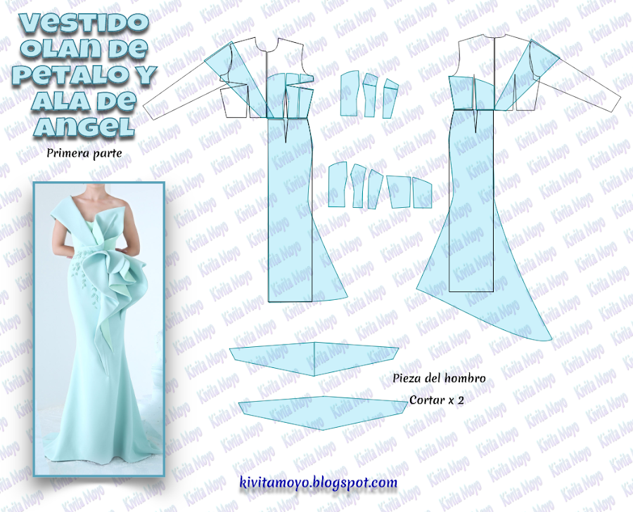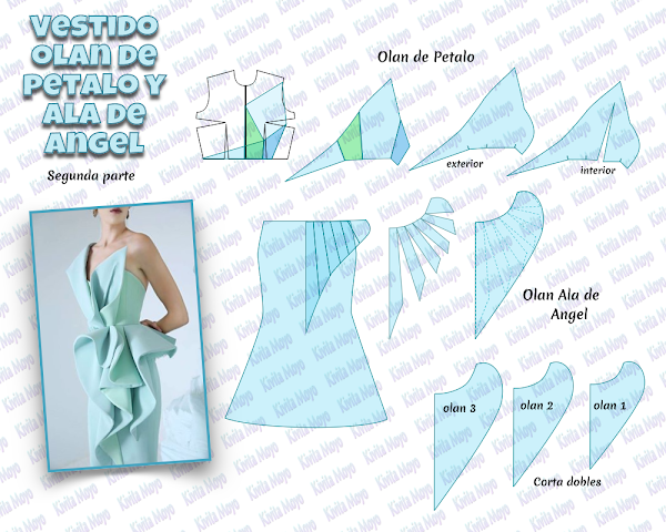 Redondear la parte saliente superior. Dividir esta pieza la cantidad de veces que se desees plegar. Recortar por estas lineas y abrirlas en forma de abanico. Se crearar el olan de Ala de Angel, que se cortara en cada uno de ellos con tela doble. Se puliran completamente y se aplicaran encima del vestido a mano haciendo los pliegues, de manera sucesiva uno a un lado del otro, en el lateral del vestido. En su interior se le puede colocar entretela de armado o crin en el margen de costura para ayudar a mentenerlo erguido. Debajo de los pliegues mas altos se puede adicionar tul fruncido al tono para sostener aun mas la postura del olan.