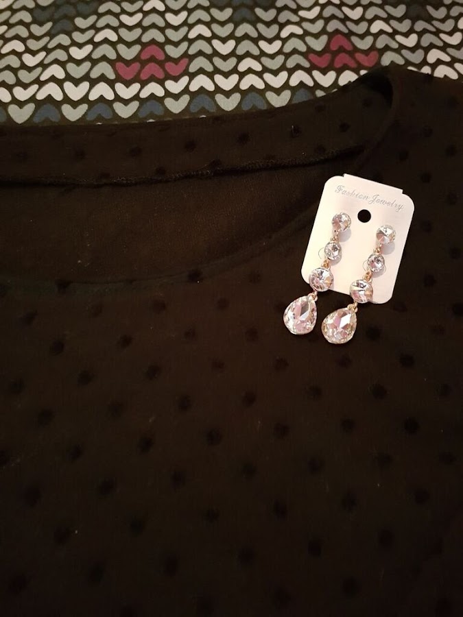 Aunque el tejido del vestido es de punto elastico de color negro , tiene un detalle que lo hace un poco especial , tiene uno topitos en relieve de terciopelo negro , como podeis apreciar en la foto y estos son los pendientes que escogi para combinar con el vestido .