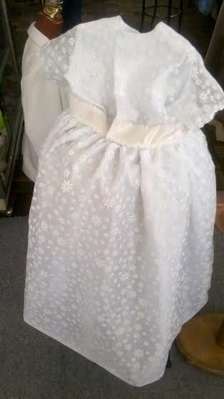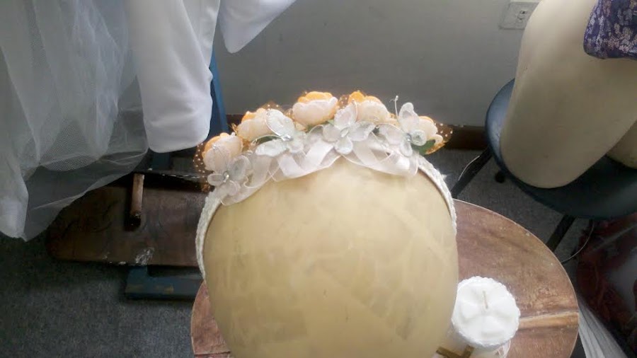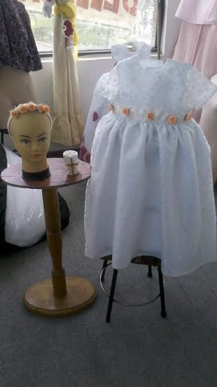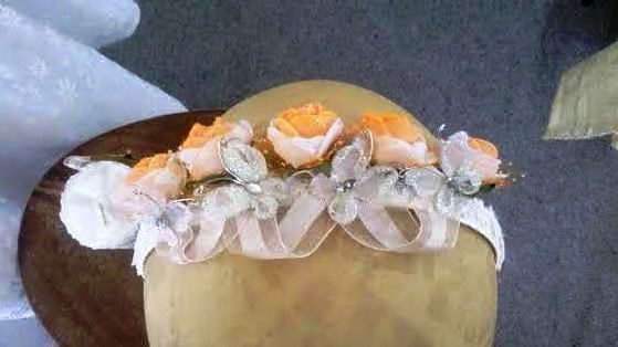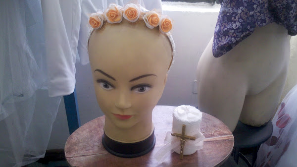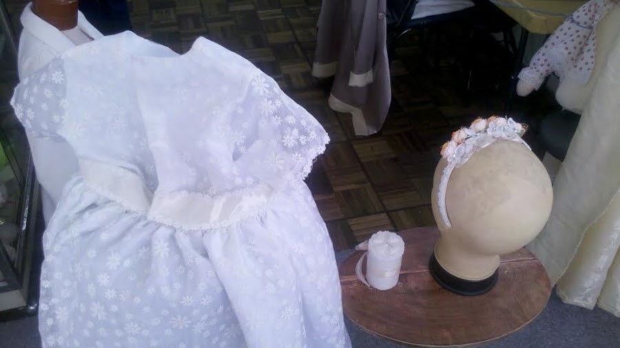 Elegante vestidito con flores y un tocado de maripositas, además de su velita con adorno de cruz.