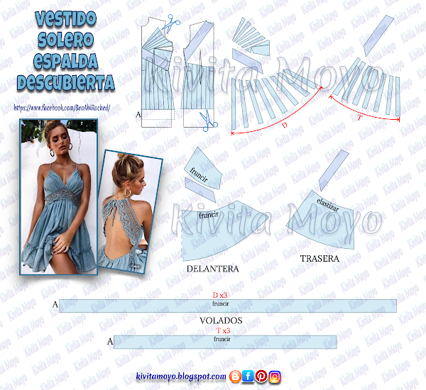 Cortar por las lineas auxiliares de las piezas, y dar espacio en medio para el fruncido. En las faldas ademas dar una inclinación mayor en los bajos para que tenga mas amplitud y vuelo.