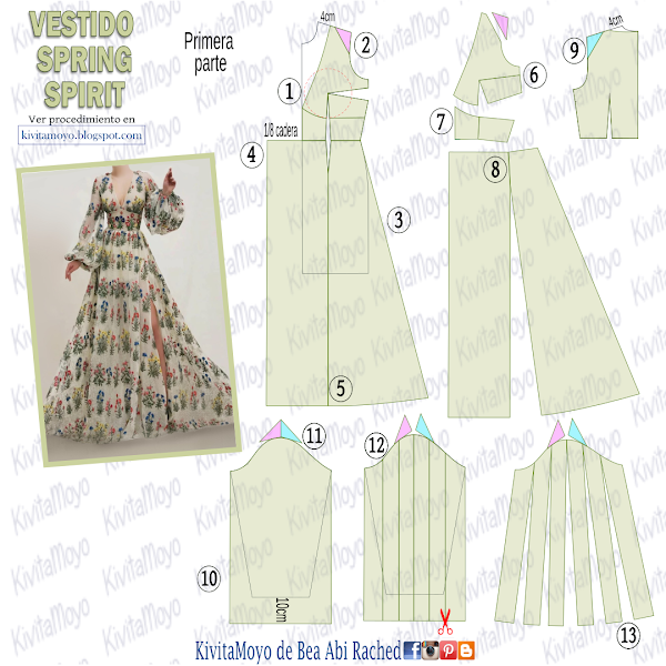 En este modelo tendremos la oportunidad de analizar varias transformaciones. En primer lugar vemos que es un corte imperio, con una cintura entallada, y un bustier con un importante escote en V, para realzar el busto. Luego una falda linea A con una notoria abertura. Y desde ya se lleva toda la atención las mangas que tienen el diseño de una raglan devenida en manga farol. No lleva puño, sino un elastizado en su abertura para dar el volumen.