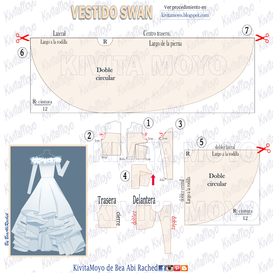 Trazar una falda doble circular en un cuadrado exacto que mida de lado la suma de el largo deseado en el frente de la falda, mas el calculo del radio obtenido dividiendo la medida de la cintura por 12. Se cortara en un pliego de tela doblado en 4. Y luego se cortara por u solo lado abriendo este circulo completo, para general el lateral de unión con la otra falda circula que seria la parte trasera de la falda en si.