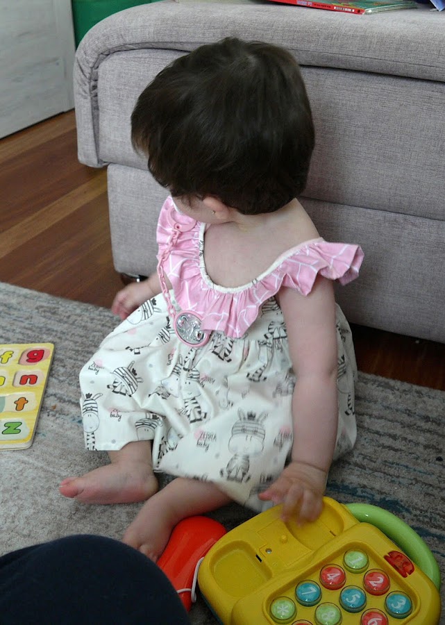 El vestido es fresquito con un volante en los tirantes y cruzado en la espalda, monísimo la verdad a mi peque la queda genial, pero las fotos no se las he podido sacar en la calle por problemas climáticos y logísticos, mi cámara no se acordaba de mi y no he sido capaz de hacerle mas de 4 fotos.