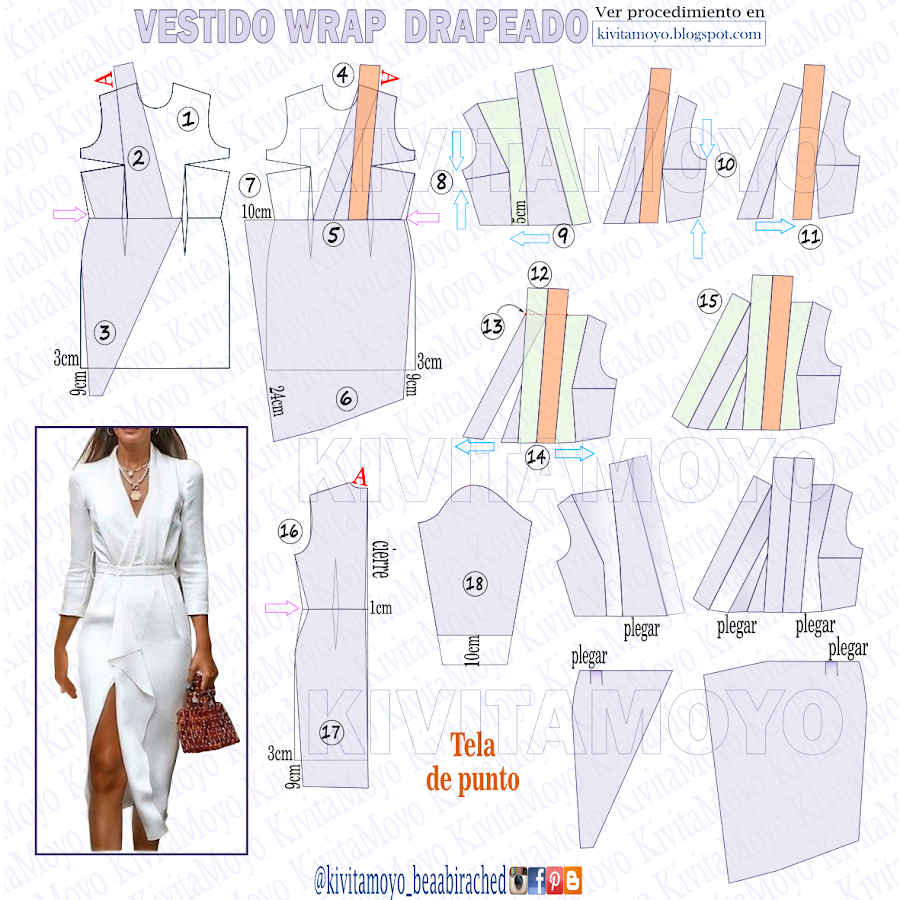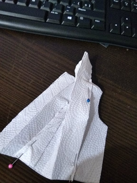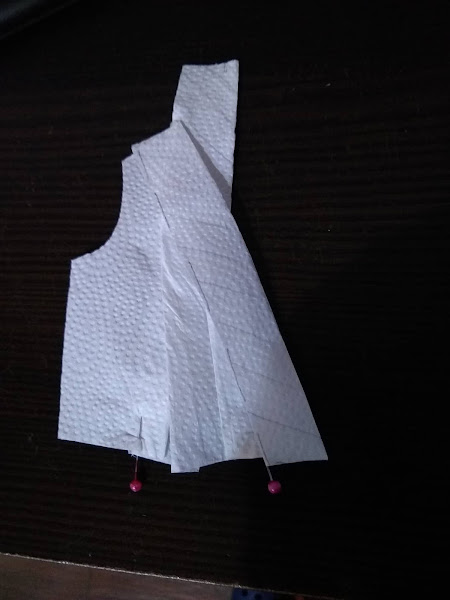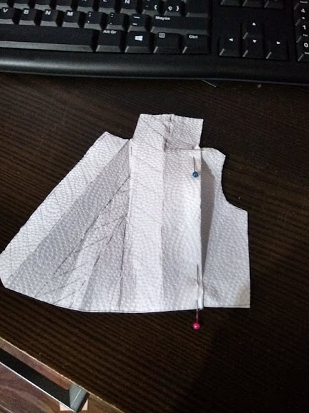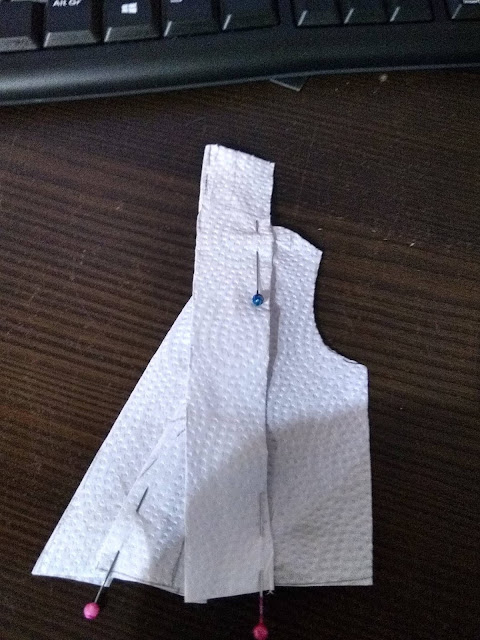 En el lado opuesto de la otra delantera el doblez que correspondería a cubrir el recorte de la pinza de busto, se dirige desde el centro hasta el lateral. A continuación del esquema dejo un mini tutorial e imagenes de como se colocarían las tablas en la parte izquierda del vestido.