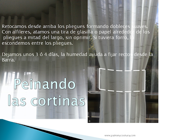 Tras coser y planchar las cortinas, las colgamos; pero a veces, el generó es dificil de dominar para que forme los pliegues, entonces es cuando damos un toque a mano. Comenzando desde la parte superior y guiamos los pliegues para que formen dobleces suaves, procurando sea la profucndidad igual en todos. Y con ayuda de una cinta o papel justo en la mitad del largo, abrazamos los pliegues, sin oprimir y sujetamos con alfileres la cinta o grapas. Lo dejamos unos días puesto para que tome forma perpendicualr al suelo.