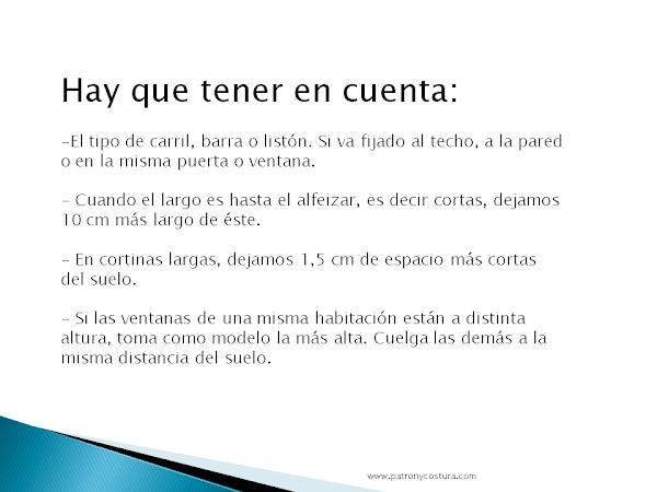Y no me enrollo más, pues espero que os ayude de veras y os atreváis a realizar vuestras cortinas, lo bueno es que son sencillas, si no te atreves a cortar, pide en la tienda que te las den con la medida si es que son dos caídas. Así no solo que serán a la medida, sino que con el tejido que te gusta y con el ahorro económico, pues ahorras un pico bueno.