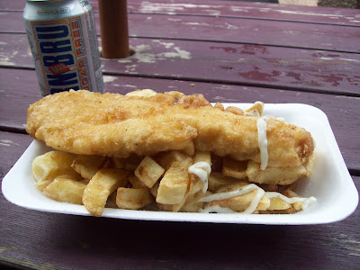 El típio Fish and Chips escocés (por lo visto no es igual que el inglés) y el Irn Bru, un refresco también típico de Escocia, muy dulzón, por lo que nos comentan se lo suelen beber para la resaca...