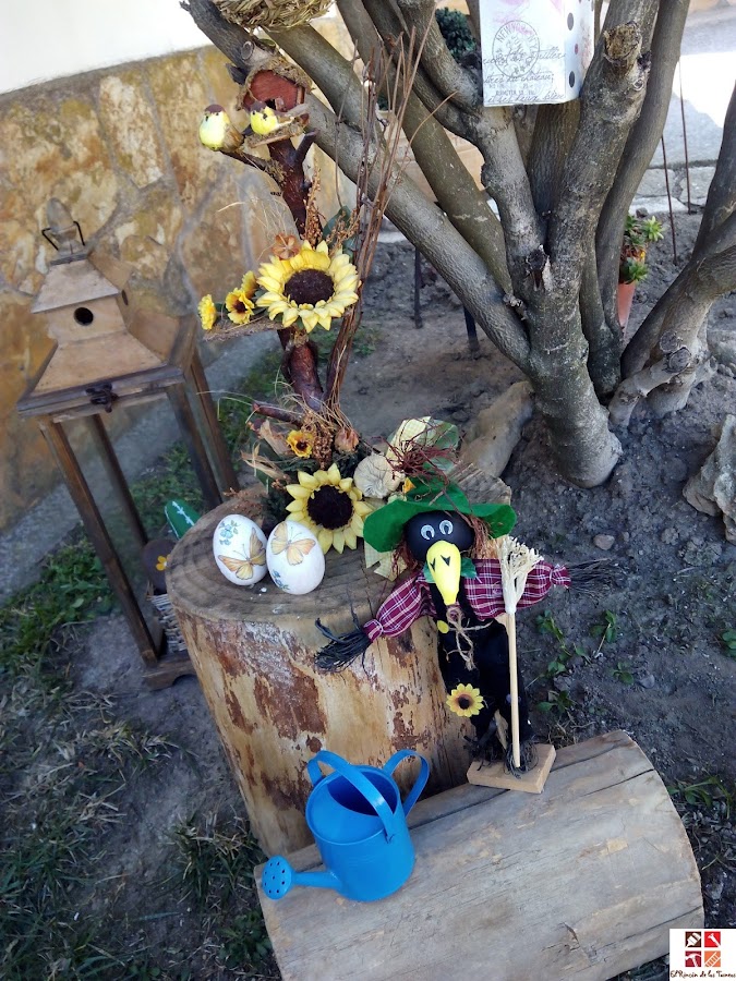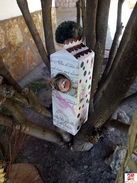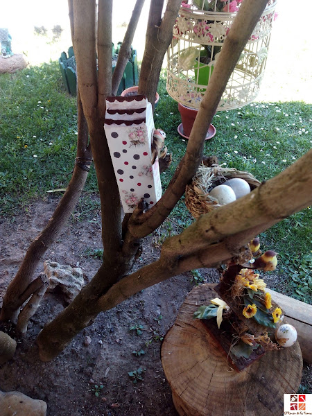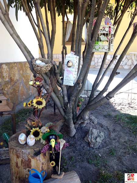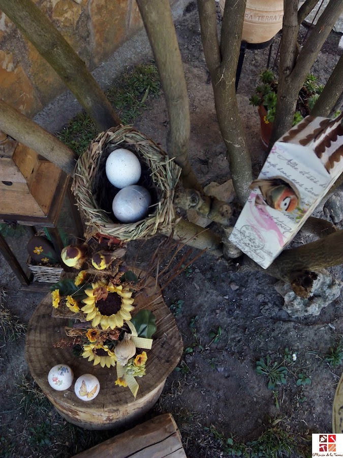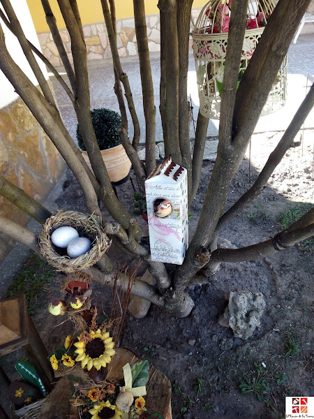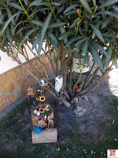 Al final me decanté por un diy de una casita de pájaros que he hecho con una caja de galletas pensando en este reto y en estas fechas de pascua, como veis la he integrado en la decoración y el entorno de mi jardín.