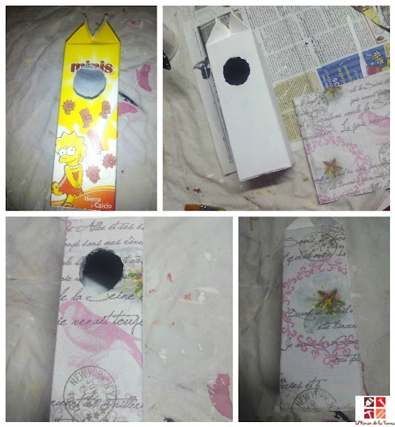 - Por último he pegado las dos solapas de la caja imitando el tejado que ya tiene su forma con este envase, he hecho un stencil con una plantilla en tonos marrones.