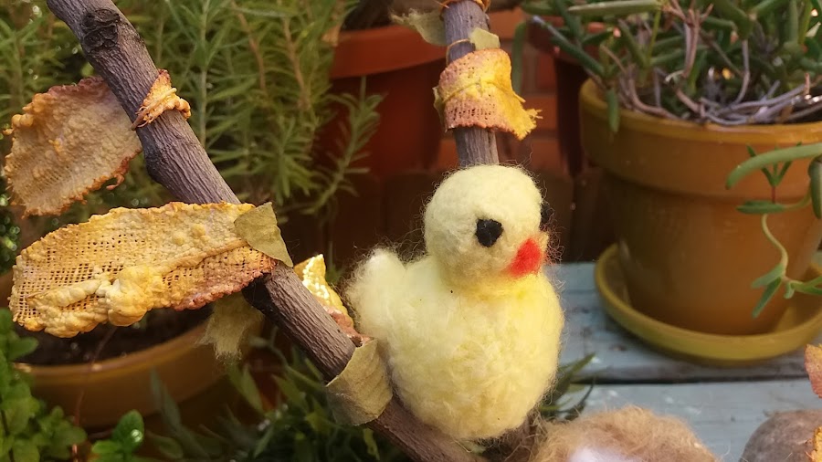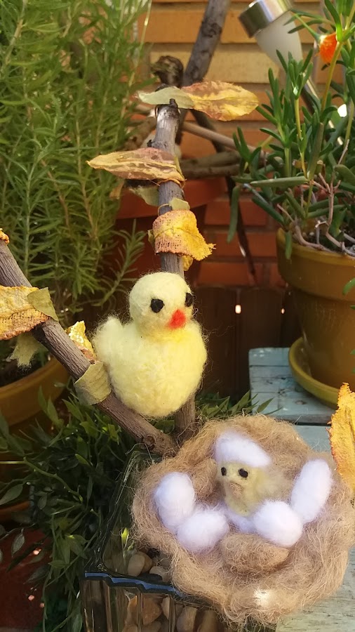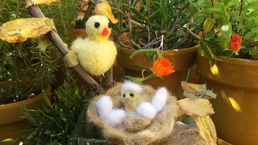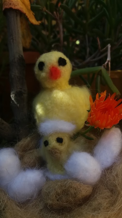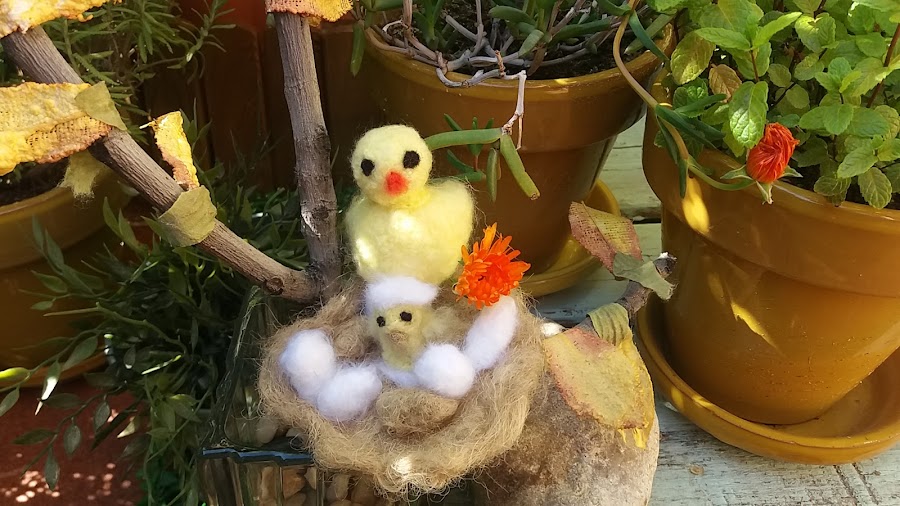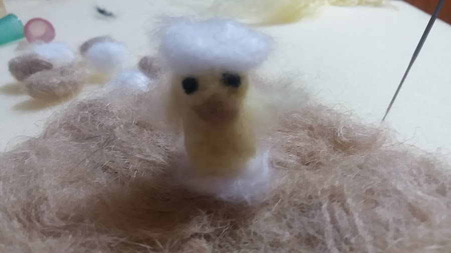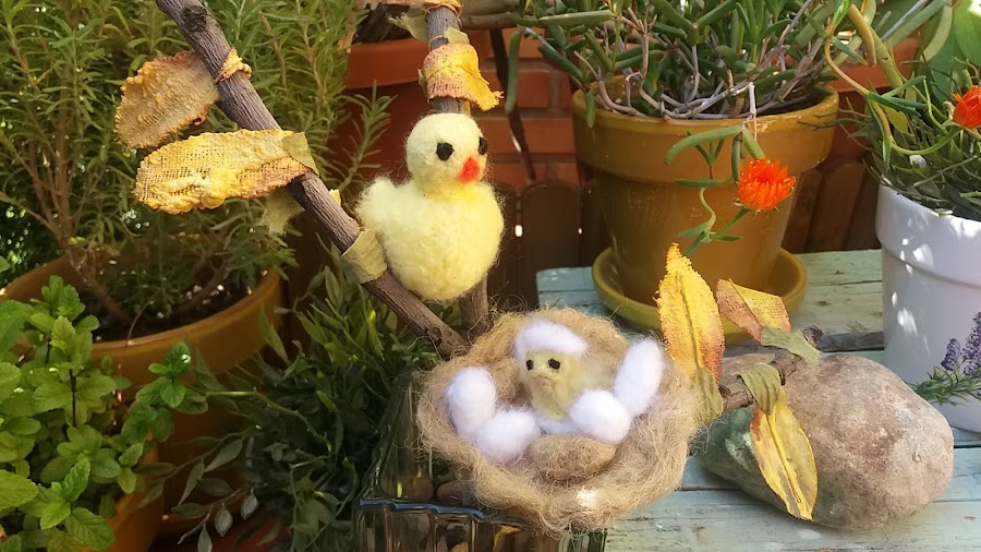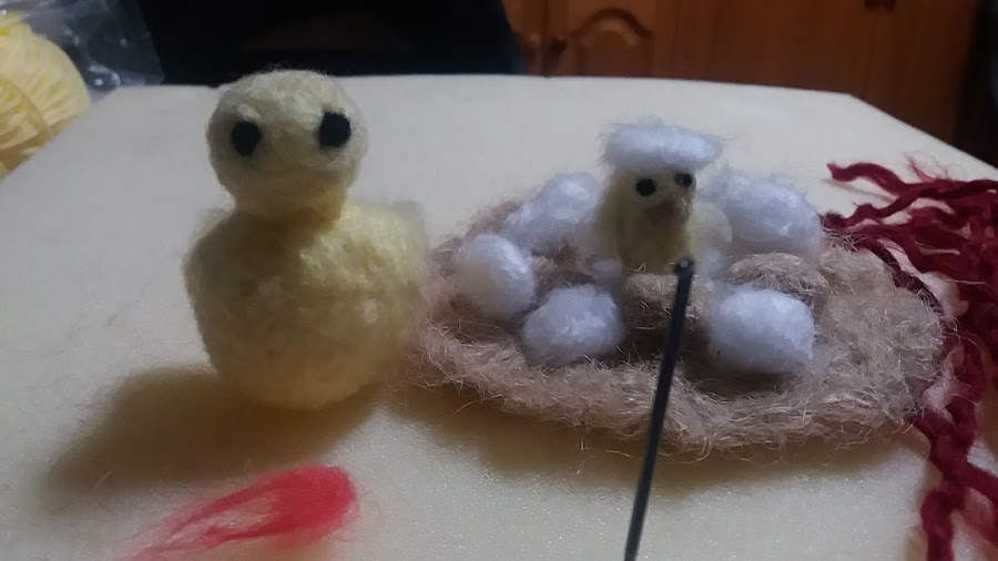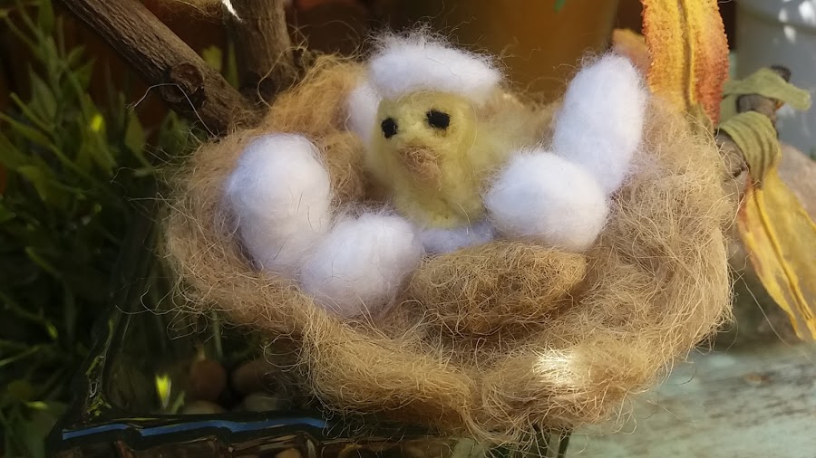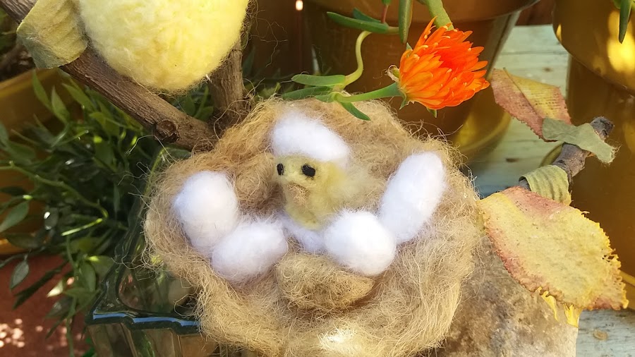 Este nido lo he realizado con hilos de cuerda, los he peinado, los huevos marrones también, y los blancos con lana que yo misma la he hecho, es muy fácil.