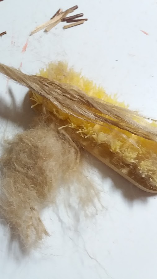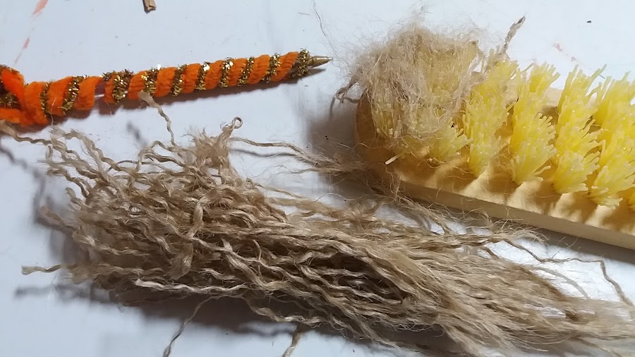 Sabéis que tanto la cuerda como la lana, está formada cada cabo por tres hilos. Pues solamente hay que ir separan dolos, y una vez terminado este paso los peinamos con un cepillo de limpiar, fuerte.