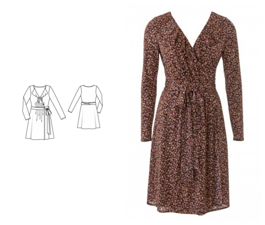 Vestido cruzado, con pliegues delanteros y un volante en el escote. Me parece muy especial, recomiendan hacerlo en tejido elástico, pero a mi me encantaría hacerlo en crep satén. Y poder jugar así con el brillo y mate.
