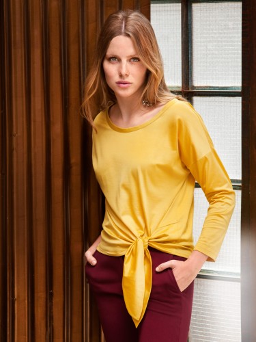 En primer lugar esta blusa, me encanta el nudo que queda hacia un lado, recomiendan tejido elástico y el nudo está realizado en tejido doble (cosido y vuelto). Muy recomendable para hacernos con un básico con estilo.