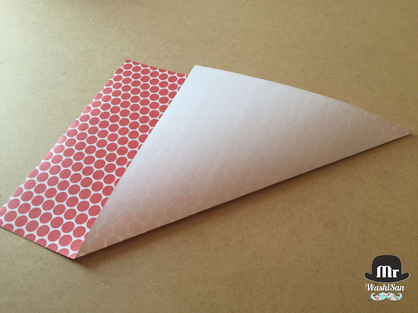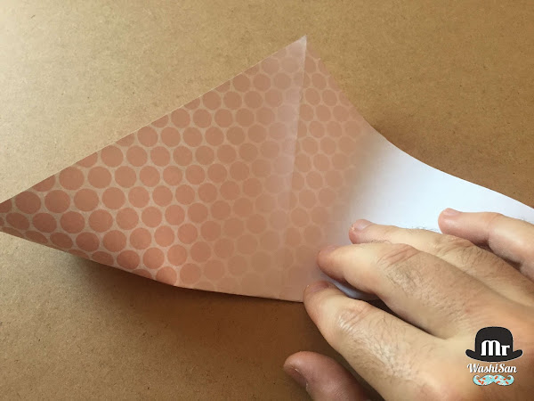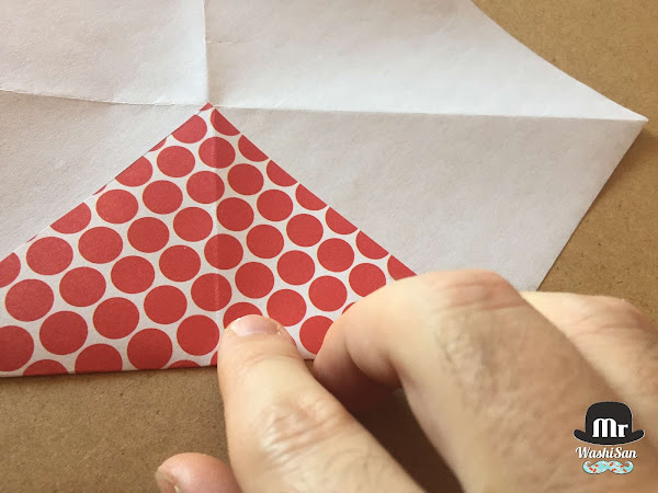 Con el lado decorado hacia abajo doblamos los 4 vértices de manera que las puntas coincidan con el vértice.