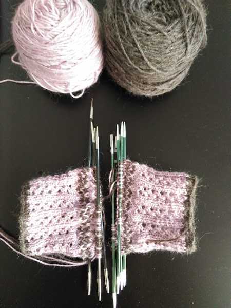 He empezado a tejer un par de Selborne, patrón gratuito de The Knitting Shed, en dos colores que me encantan juntos. De momento me está gustando mucho el patrón, claro que no he avanzado demasiado todavía. Los tejo usando dos pares de dobles puntas porque avanzo mucho más rápido que usando una circular larga o circulares cortitas.