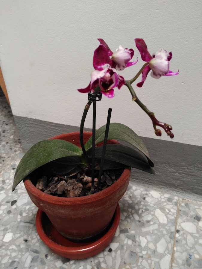 Esta es mi mini orquídea, que después de año y medio en casa ha decidido ha florecer por fin. Tiene un colorido casi idéntico a una socks que tiñó para mi Ardilanak el año pasado. Casualidad?
