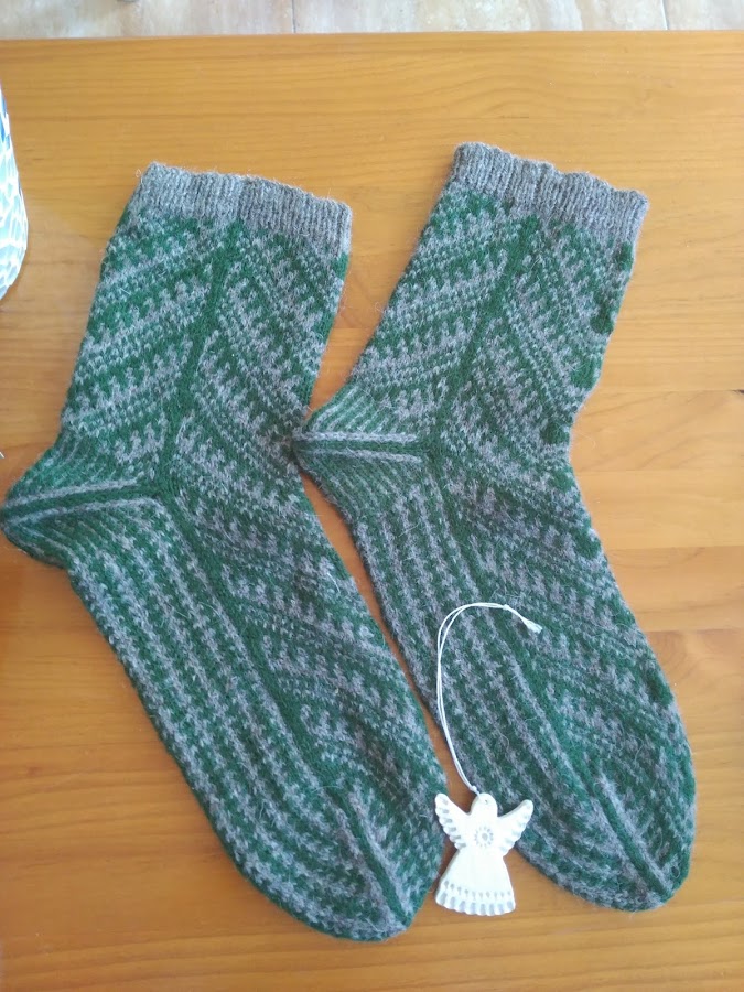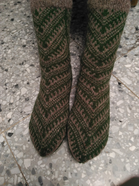Los calcetines son los primeros que tengo tejidos con la técnica de Fair isle, son muy cómodos y calentitos, y el diseño me encanta, es preciosísimo! Lamento que la foto esté oscura, pero me ha costado pillar bien los colores reales de los calcetines. Me quedan un pelín largos, pero no me preocupa, se ajustarán a mis pies con el tiempo y algún lavado. Mil gracias por todo Elina, has sido una sorprendedora maravillosa :)