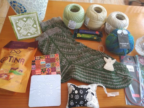 Que si, que no se me ha ido la pinza. Se que es miércoles, pero es que mi paquete del Swapetines de este año llegó ayer, por obra y gracia de Correos, que lo tenía retenido desde el día 22 y casi casi lo devuelve. Por circunstancias de la vida no he podido destaparlo y disfrutarlo hasta hace unos minutos. Mi sorprendedora de este año ha sido Elina, que me ha enviado unos calcetines preciosos desde Letonia, y un montón de chuches tejeriles que me tienen enamorada :).