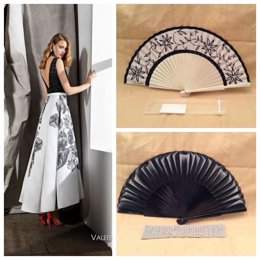 Y para este este espectacular vestido con cuerpo negro y falda con un dibujo a trazos otros dos modelos de abanicos de diseño sencillo.