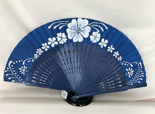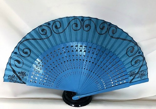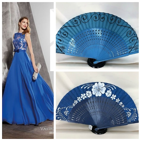Un vestido azul espectacular para el que he elegido estos dos modelos de abanicos,perfecto para llevar en ese bolso cartera que luce la modelo.