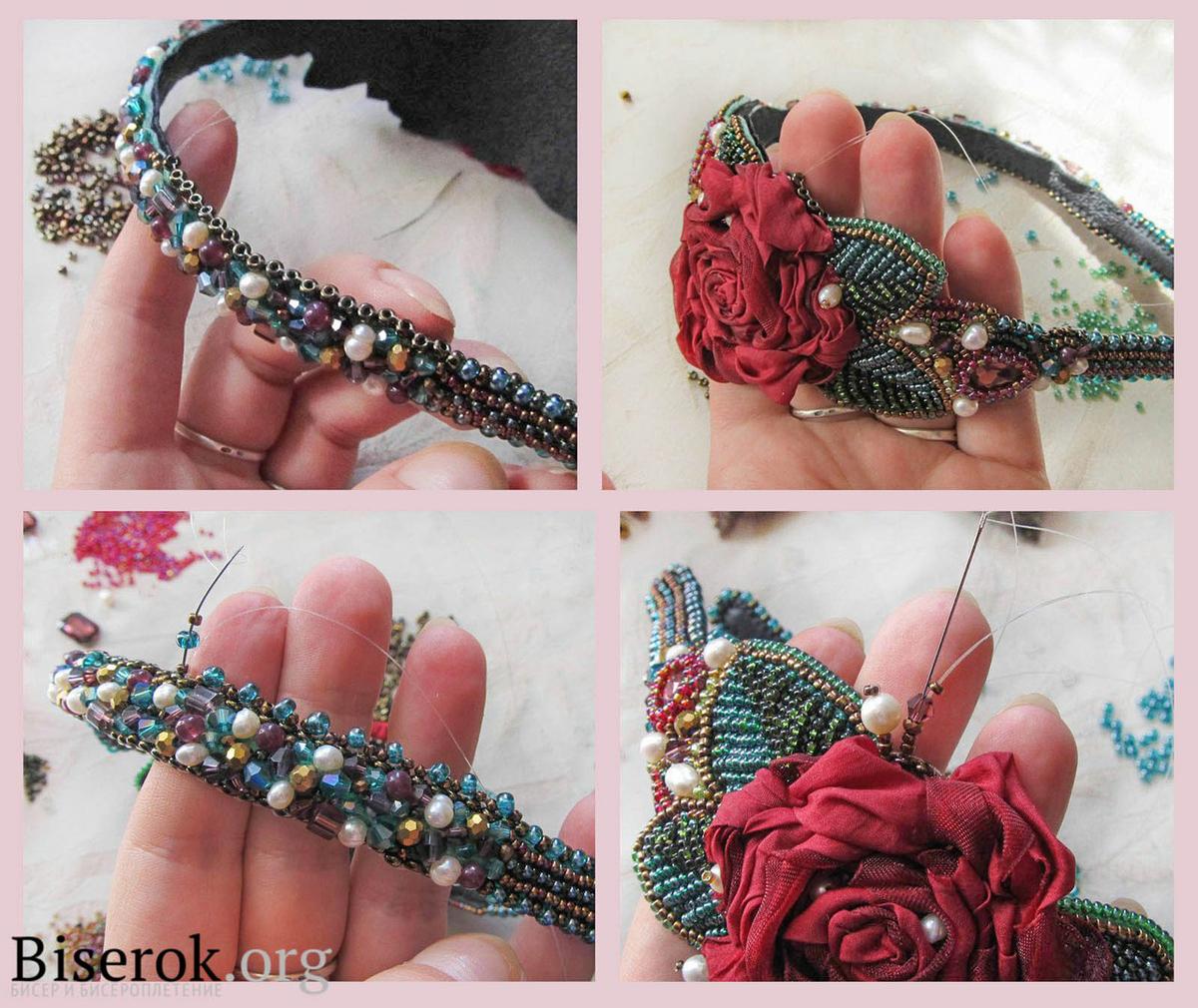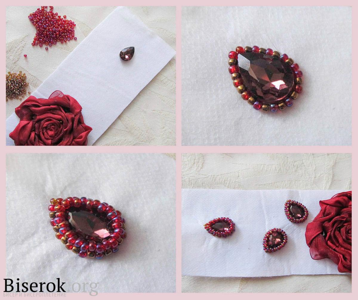 Primero elaboramos una rosa de tela o cinta ligera como la organza, por ejemplo. Luego bordamos los elementos decorativos con las piedritas y mostacillas.