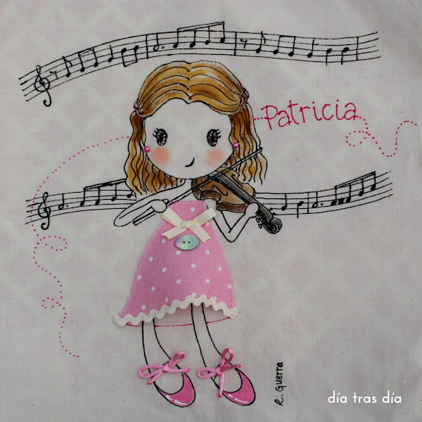 Desde entonces no había vuelto a repetir bolso con temática musical hasta ahora. Y precisamente ha dado la casualidad de que en la misma semana recibí dos encargos diferentes para dos niñas distintas justamente con el mismo dibujo: Ro-ro violinista.